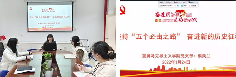 當(dāng)前,福建省新冠肺炎疫情仍在持續(xù),防控形勢依然十分嚴(yán)峻。我校直屬馬克思主義學(xué)院黨支部開啟“云黨建”模式——黨支部書記熊美蘭化身“主播”,以“雙帶頭人”工作室為主會場,采用線上線下相結(jié)合的方式,為全體支部黨員作《堅持“五個必由之路” 奮進新的歷史征程——學(xué)習(xí)貫徹2022年全國兩會精神》的專題黨課,保障黨建不斷線、學(xué)習(xí)不斷檔。