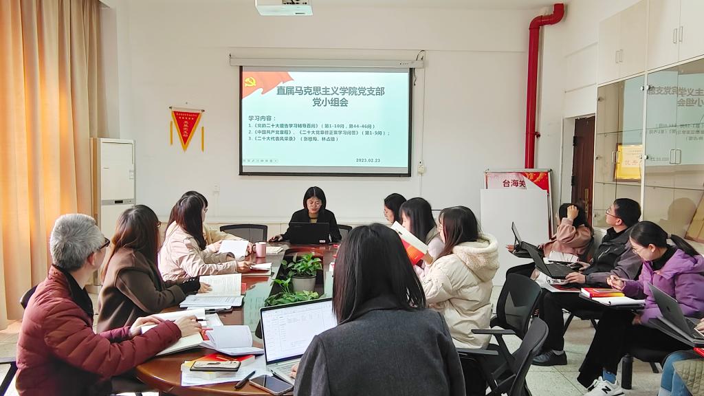 2月23日上午,直屬馬克思主義學院黨支部在行政樓107會議室開展2022年度組織生活會會前集中理論學習,會議由直屬馬克思主義學院黨支部副書記來朋珍主持,全體黨員參加。