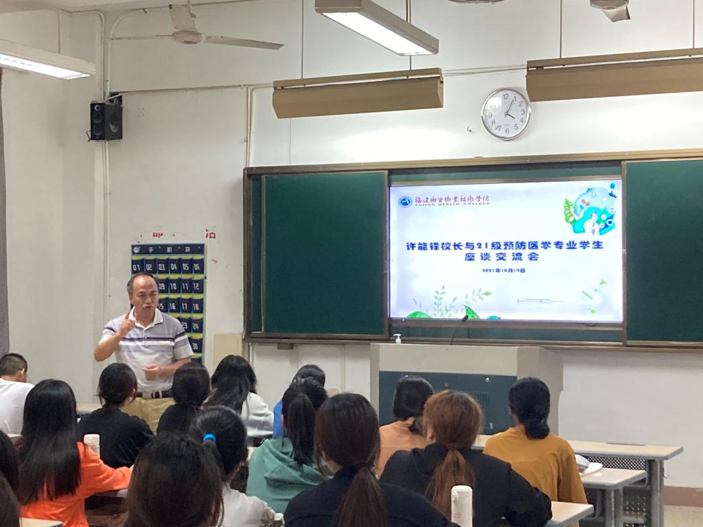10月19日下午,校長許能鋒在教學樓203為21預防醫(yī)學專業(yè)學生開展座談會,預防班全體48位同學參加會議。