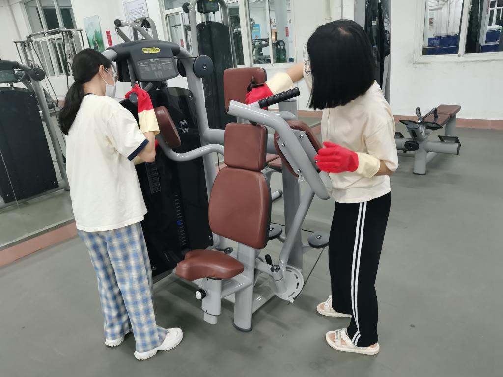 疫情期間,體育場館在做好疫情防控的基礎(chǔ)上對全體師生開放,邀請物業(yè)經(jīng)理黃榕對學(xué)生志愿者進(jìn)行消殺培訓(xùn)。師生活動中心的器械每天都有志愿者用消毒水定時擦拭,地面由物業(yè)每天定時消殺,場地保持通風(fēng)。