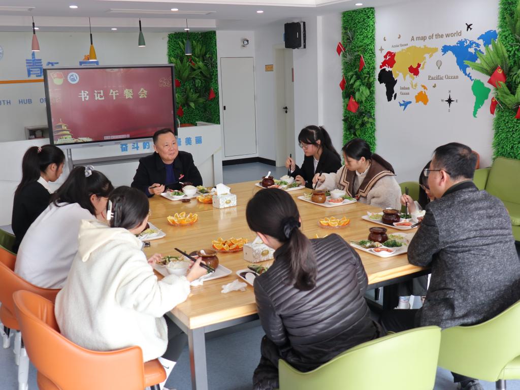 12月22日,校黨委書記曾武祈來到學(xué)校青年之家,與習(xí)近平新時(shí)代中國特色社會(huì)主義思想讀書社成員進(jìn)行溝通交流,與聯(lián)系宿舍的同學(xué)進(jìn)行溫馨午餐會(huì)。