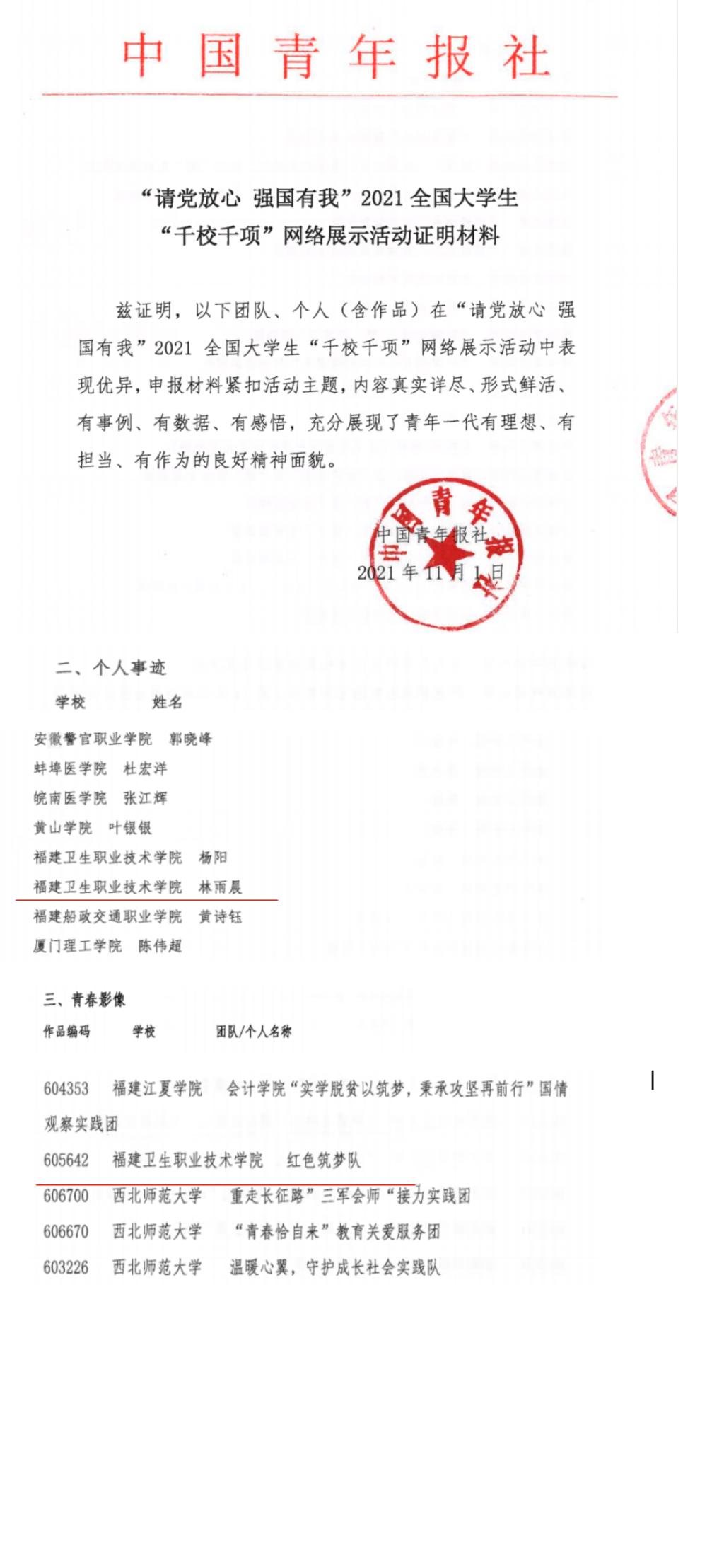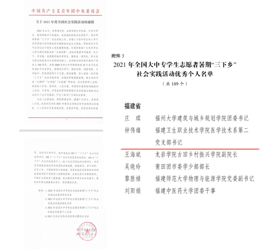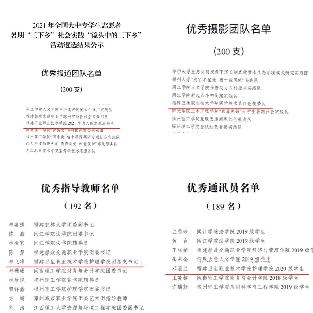 為深入總結(jié)經(jīng)驗(yàn)、做好典型宣傳,激勵(lì)廣泛參與、發(fā)揮育人實(shí)效,近日,團(tuán)中央青年發(fā)展部對(duì)2021年度社會(huì)實(shí)踐活動(dòng)表現(xiàn)突出的集體、個(gè)人和項(xiàng)目進(jìn)行通報(bào)表揚(yáng)。我校首次在全國(guó)“三下鄉(xiāng)”社會(huì)實(shí)踐活動(dòng)獲得表彰,鐘偉雄老師被評(píng)為全國(guó)“優(yōu)秀個(gè)人”。同時(shí),團(tuán)中央青年發(fā)展部、中國(guó)青年報(bào)、中國(guó)青年網(wǎng)共同舉辦2021年全國(guó)大中專學(xué)生志愿者暑期“三下鄉(xiāng)”社會(huì)實(shí)踐“鏡頭中的三下鄉(xiāng)”活動(dòng)遴選結(jié)果于近日公示,我校護(hù)理學(xué)院夢(mèng)飛天使志愿服務(wù)隊(duì)獲“優(yōu)秀報(bào)道團(tuán)隊(duì)”,林飛準(zhǔn)老師獲“優(yōu)秀指導(dǎo)教師”,醫(yī)學(xué)技術(shù)系紅色筑夢(mèng)隊(duì)獲“優(yōu)秀攝影團(tuán)隊(duì)”,護(hù)理學(xué)院鄧顯蘭同學(xué)獲“優(yōu)秀通訊員”榮譽(yù)稱號(hào)。在中國(guó)青年報(bào)社發(fā)布的2021年全國(guó)大學(xué)生“千校千項(xiàng)”網(wǎng)絡(luò)展示活動(dòng)中,我校楊陽、林雨晨同學(xué)獲“優(yōu)秀個(gè)人事跡”,醫(yī)學(xué)技術(shù)系紅色筑夢(mèng)隊(duì)獲“優(yōu)秀青春影像”獎(jiǎng)項(xiàng)。
