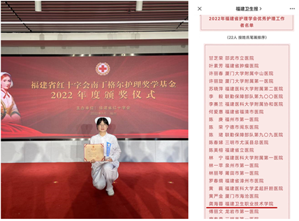 5月12日,福建省紅十字會南丁格爾護理獎學(xué)基金2022年度頒獎儀式在福州舉行。大會公布了2022年度推選出的30名南丁格爾獎學(xué)金獲得者,我校護理學(xué)院2019級護理319班李淋燕同學(xué)獲此殊榮。