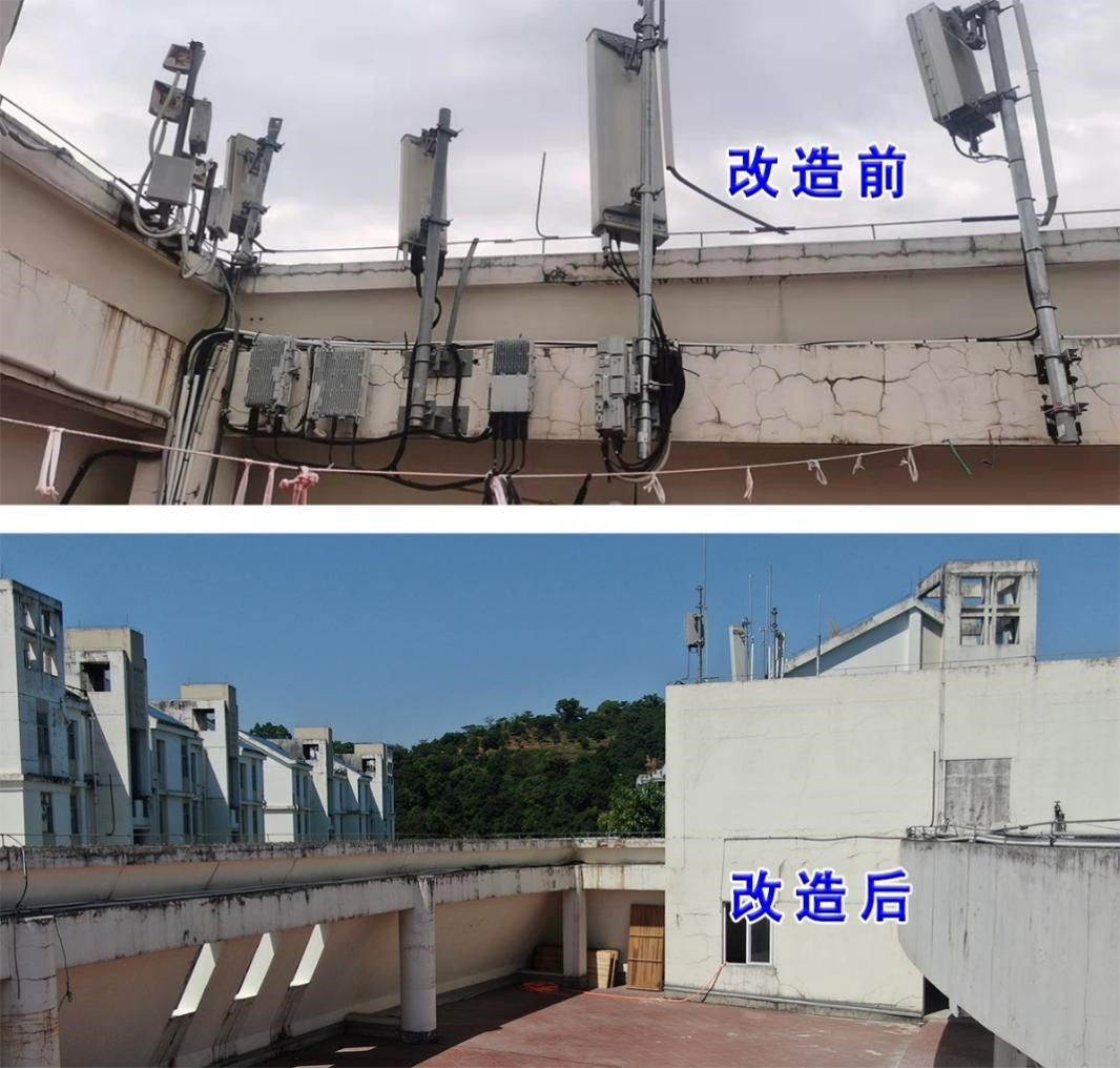 拆除并優(yōu)化明湖餐廳4樓等場(chǎng)所的運(yùn)營商基站抱桿,消除管線“蜘蛛網(wǎng)”等視覺污染,校園環(huán)境更加清爽整潔。