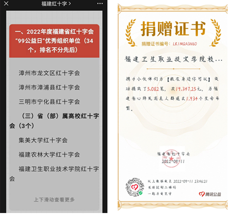 2022年“99公益日”期間,我校積極響應(yīng)號(hào)召,統(tǒng)一部署、上下聯(lián)動(dòng),開展網(wǎng)絡(luò)募捐活動(dòng),動(dòng)員捐款5000余人次,募捐金額19000余元,在2022年度福建省紅十字會(huì)“99公益日”優(yōu)秀組織單位?。ú浚俑咝<t十字會(huì)中位居前三,獲“2022年度福建省紅十字會(huì)‘99公益日’優(yōu)秀組織單位”。
