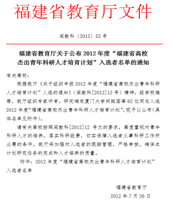 1.2012年入選“福建省高等學(xué)校杰出青年科研人才培育計(jì)劃”