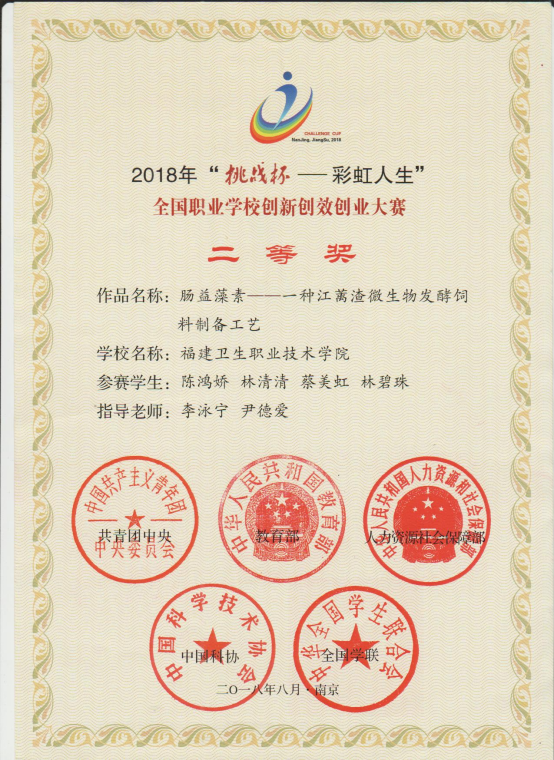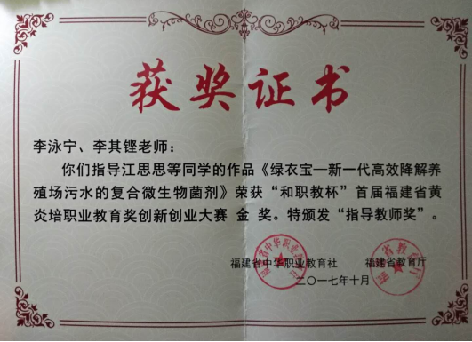 此外,在全國(guó)高校積極響應(yīng)國(guó)家“大眾創(chuàng)業(yè)、萬(wàn)眾創(chuàng)新”的號(hào)召和推進(jìn)高等學(xué)校創(chuàng)新創(chuàng)業(yè)教育和大學(xué)生自主創(chuàng)業(yè)工作的等文件精神指導(dǎo)下,李泳寧在校院領(lǐng)導(dǎo)的支持下,以學(xué)院實(shí)踐教學(xué)基地建設(shè)為平臺(tái)促進(jìn)學(xué)生創(chuàng)新創(chuàng)業(yè)活動(dòng),按“創(chuàng)新意識(shí)培養(yǎng)+創(chuàng)新實(shí)踐試點(diǎn)”的培養(yǎng)思路,以“專業(yè)教師+學(xué)生”的培養(yǎng)模式,全程跟進(jìn)學(xué)生創(chuàng)新創(chuàng)業(yè)實(shí)踐活動(dòng),構(gòu)建“師徒式”創(chuàng)新創(chuàng)業(yè)體系,取得良好成效。2017年初,李泳寧以校企科研合作項(xiàng)目“高效降解養(yǎng)殖場(chǎng)污水的復(fù)合微生物菌劑的研制及應(yīng)用”為切入點(diǎn),指導(dǎo)了江思思等5同學(xué)組成創(chuàng)新創(chuàng)業(yè)團(tuán)隊(duì)參與了該項(xiàng)目的技術(shù)研究,經(jīng)過(guò)一次次的菌種培養(yǎng)、篩選、試驗(yàn)、測(cè)評(píng),篩選獲得了耐受能力強(qiáng)、降解效率高的地衣芽孢桿菌和硝化細(xì)菌。之后,帶領(lǐng)學(xué)生創(chuàng)新團(tuán)隊(duì)在生豬養(yǎng)殖場(chǎng)臭氣熏天的污水處理池進(jìn)行了長(zhǎng)達(dá)5個(gè)月的現(xiàn)場(chǎng)調(diào)試試驗(yàn),學(xué)生創(chuàng)新團(tuán)隊(duì)開(kāi)發(fā)的新一代高效降解養(yǎng)殖場(chǎng)污水的復(fù)合微生物菌劑在養(yǎng)殖場(chǎng)污水處理中,不僅縮短了污水中污染物的降解周期,養(yǎng)殖污水各指標(biāo)也優(yōu)于國(guó)家排放標(biāo)準(zhǔn)。2017年10月,在福建省首屆面向職業(yè)院校的創(chuàng)新創(chuàng)業(yè)賽事“和職教杯”首屆福建省黃炎培職業(yè)教育獎(jiǎng)創(chuàng)新創(chuàng)業(yè)大賽中,學(xué)生創(chuàng)新團(tuán)隊(duì)作品“綠衣寶—新一代高效降解養(yǎng)殖場(chǎng)污水的復(fù)合微生物菌劑”項(xiàng)目榮獲福建省黃炎培職業(yè)教育獎(jiǎng)創(chuàng)新創(chuàng)業(yè)大賽高職組金獎(jiǎng),李泳寧獲指導(dǎo)教師獎(jiǎng),這是學(xué)校開(kāi)展創(chuàng)新創(chuàng)業(yè)教育和實(shí)踐活動(dòng)以來(lái)首次獲得的榮譽(yù),為其他各項(xiàng)創(chuàng)新創(chuàng)業(yè)活動(dòng)的開(kāi)展奠定了良好的基礎(chǔ)。2018年6月,李泳寧指導(dǎo)學(xué)生參加 “挑戰(zhàn)杯——彩虹人生”創(chuàng)新創(chuàng)效創(chuàng)業(yè)大賽獲省賽一等獎(jiǎng)和全國(guó)二等獎(jiǎng);2021年5月指導(dǎo)學(xué)生參加第十五屆“挑戰(zhàn)杯”福建省大學(xué)生課外學(xué)術(shù)科技作品競(jìng)賽獲得三等獎(jiǎng);2021年7月指導(dǎo)學(xué)生參加第七屆福建省“互聯(lián)網(wǎng)+”大學(xué)生創(chuàng)新創(chuàng)業(yè)大賽獲得銅獎(jiǎng)。眾多獎(jiǎng)勵(lì)的背后是他無(wú)數(shù)個(gè)日日夜夜指導(dǎo)學(xué)生、加班加點(diǎn)、無(wú)私奉獻(xiàn)的成果。