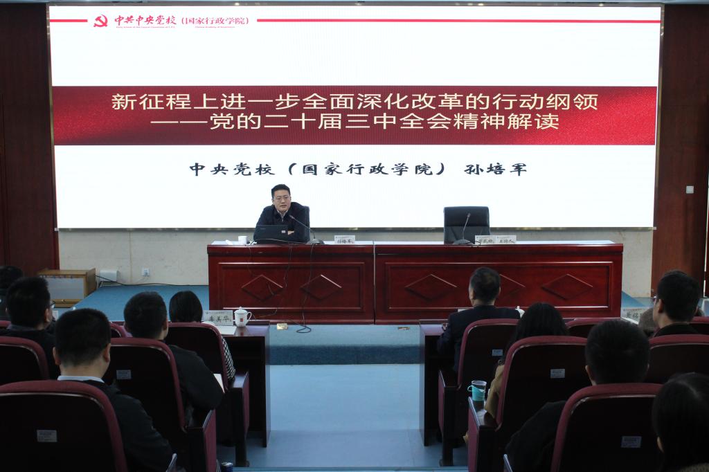 黨的二十屆三中全會是我們黨的歷史上又一個重要里程碑,是進(jìn)一步全面深化改革、推進(jìn)中國式現(xiàn)代化的總動員、總部署,深刻回答了在新的歷史條件下舉什么旗、走什么路、改什么、為誰改、怎么改等重大問題,在黨和國家發(fā)展進(jìn)程中具有極其重大和深遠(yuǎn)的歷史意義。為進(jìn)一步學(xué)習(xí)貫徹落實黨的二十屆三中全會精神,完整、準(zhǔn)確、全面理解《決定》的重大意義、措施要求,切實把全會精神轉(zhuǎn)化為干事創(chuàng)業(yè)的精氣神、改革創(chuàng)新的源動力,促進(jìn)學(xué)校高質(zhì)量發(fā)展。12月13日,校黨委理論學(xué)習(xí)中心組舉行擴(kuò)大會議,邀請中央黨校孫培軍教授為我們作《新征程上進(jìn)一步全面深化改革的行動綱領(lǐng)——黨的二十屆三中全會精神解讀》專題輔導(dǎo)報告。會議由校黨委書記曾武祈主持,校領(lǐng)導(dǎo)、副科級以上干部、支部書記、專職組織員、馬克思主義學(xué)院全體教師及團(tuán)學(xué)骨干代表共同參加會議。