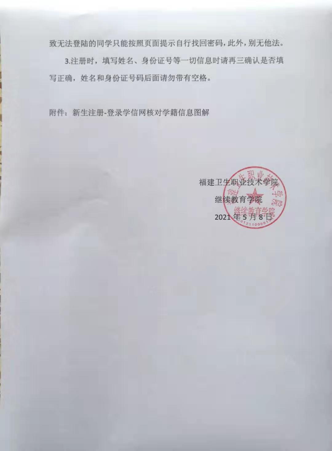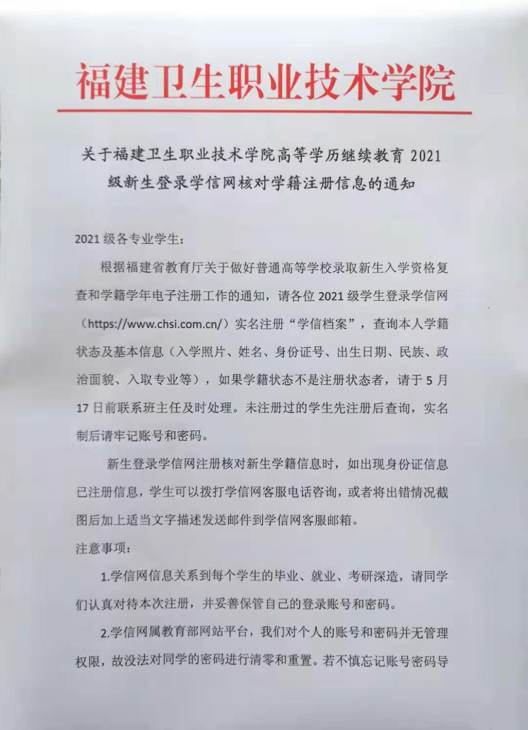 關(guān)于福建衛(wèi)生職業(yè)技術(shù)學(xué)院高等學(xué)歷繼續(xù)教育2021級(jí)新生登錄學(xué)信網(wǎng)核對(duì)學(xué)籍注冊(cè)信息的通知