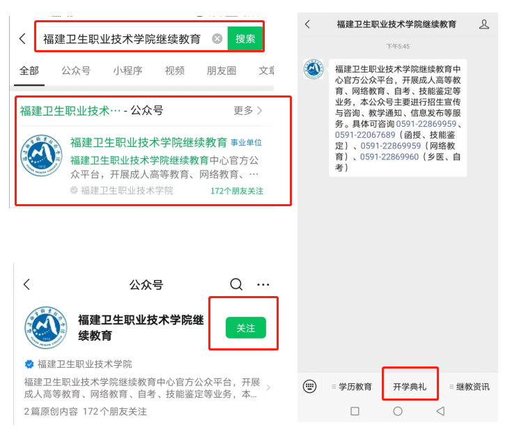 觀看方法二:手機(jī)微信點(diǎn)擊搜索并關(guān)注“福建衛(wèi)生職業(yè)技術(shù)學(xué)院繼續(xù)教育”公眾號(hào),導(dǎo)覽欄點(diǎn)擊“開(kāi)學(xué)典禮”,點(diǎn)擊直播觀看。如下圖: