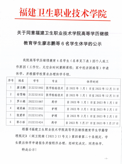 關于同意福建衛(wèi)生職業(yè)技術學院高等學歷繼續(xù)教育學生廖志鵬等6名學生休學的公示