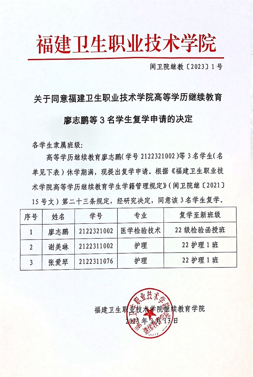 關(guān)于同意福建衛(wèi)生職業(yè)技術(shù)學(xué)院高等學(xué)歷繼續(xù)教育廖志鵬等3名學(xué)生復(fù)學(xué)申請(qǐng)的決定