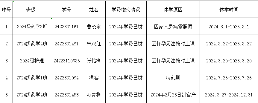 關(guān)于洪容、朱雙紅等5名高等學(xué)歷繼續(xù)教育學(xué)生休學(xué)的公示