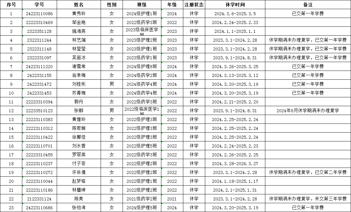 根據(jù)《福建衛(wèi)生職業(yè)技術學院高等學歷繼續(xù)教育學生學籍管理規(guī)定》(閩衛(wèi)院繼〔2021〕15號)中“學生休學原則上以一學年為期。學生休學期間,保留學籍。休學時間不計入在校學習時間。學生在校期間只能休學一次”;“學生休學期滿,應于學年或學期前一個月向學校申請復學”。黃秀鈴等23名學生即將休學期滿(名單詳見附件),應于2025年3月20日前復學,并按流程辦理復學審批手續(xù)。