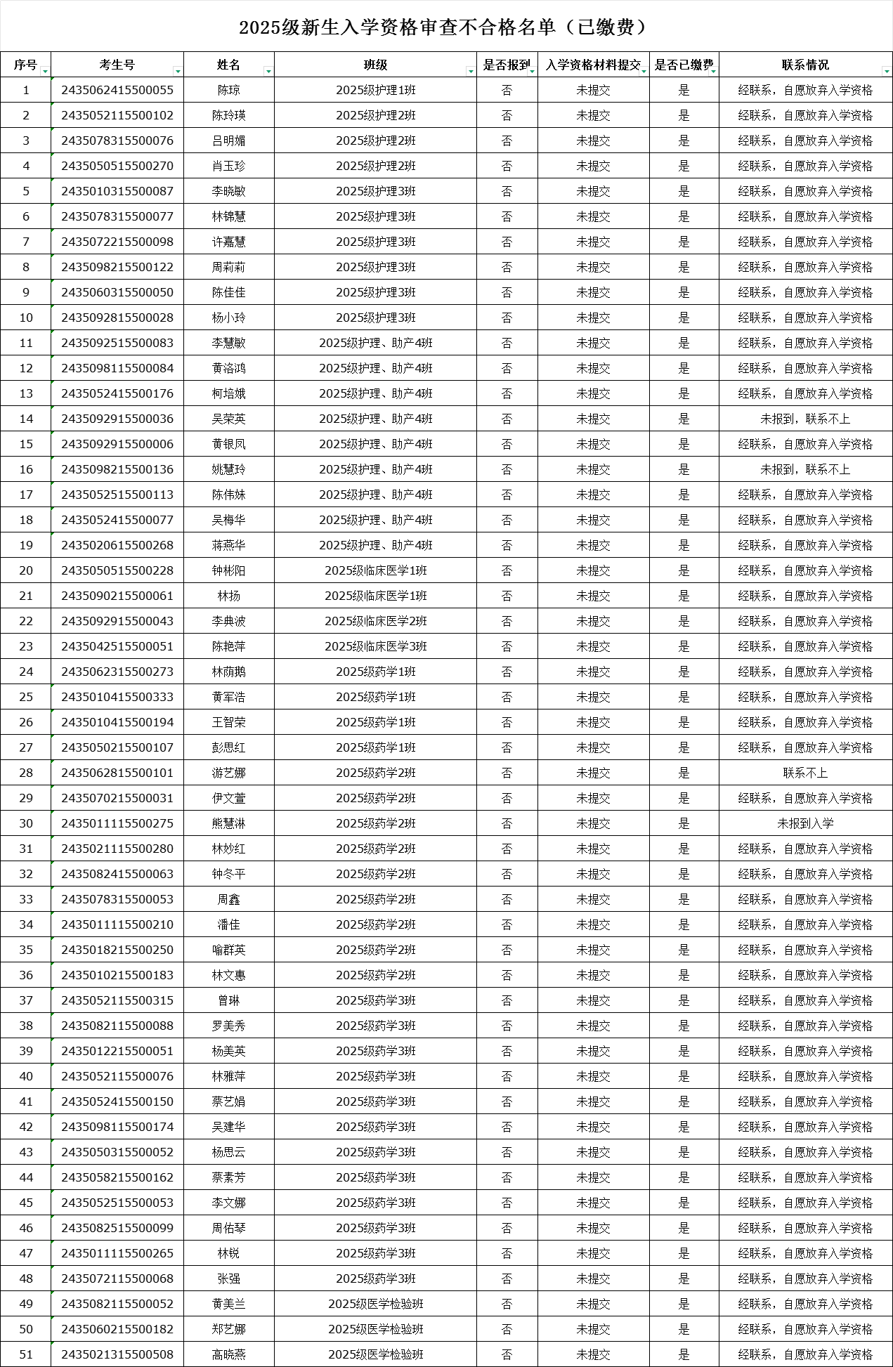根據(jù)《福建衛(wèi)生職業(yè)技術(shù)學(xué)院高等學(xué)歷繼續(xù)教育學(xué)生學(xué)籍管理規(guī)定》第一章第一條規(guī)定:“按高校學(xué)歷繼續(xù)教育招生統(tǒng)一考試錄取的新生,入學(xué)時須持我校簽發(fā)的《錄取通知書》和有關(guān)證件,按學(xué)校有關(guān)要求和規(guī)定的期限到校辦理入學(xué)手續(xù)。因故不能按期入學(xué)者,應(yīng)以書面形式向繼續(xù)教育學(xué)院提出延遲入學(xué)申請,延遲時間一般不得超過面授學(xué)時的1/3。未申請或者申請逾期者,除因不可抗力等正當(dāng)事由外,視為放棄入學(xué)資格。”經(jīng)班主任聯(lián)系確認(rèn)、學(xué)院核查,2025級陳瓊等51名錄取新生逾期未辦理入學(xué)手續(xù)(具體名單見附件),未提交入學(xué)資格審核材料,現(xiàn)將相關(guān)情況予以公示。請相關(guān)學(xué)生從即日起5日內(nèi)與本校繼續(xù)教育學(xué)院聯(lián)系,辦理退費手續(xù)。