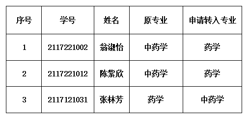 根據(jù)中國藥科大學(xué)繼續(xù)教育學(xué)院相關(guān)管理規(guī)定,2021級翁淑怡等3人因個人工作需要等原因,提出轉(zhuǎn)專業(yè)申請,經(jīng)班主任審核,我站研究審議,該3名學(xué)生符合轉(zhuǎn)專業(yè)條件,同意轉(zhuǎn)專業(yè),并上報中國藥科大學(xué)繼續(xù)教育學(xué)院審批。