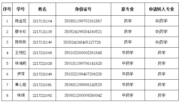 根據(jù)中國藥科大學(xué)繼續(xù)教育學(xué)院相關(guān)管理規(guī)定,2022級陳金花等8人因個人工作需要等原因,提出轉(zhuǎn)專業(yè)申請,經(jīng)班主任審核,我站研究審議,該3名學(xué)生符合轉(zhuǎn)專業(yè)條件,同意轉(zhuǎn)專業(yè),并上報中國藥科大學(xué)繼續(xù)教育學(xué)院審批。 現(xiàn)將轉(zhuǎn)專業(yè)名單予以公示,公示期12月19日至12月23日,如有異議,請以書面形式在公示期內(nèi)向我站反饋。聯(lián)系電話:0591-22869959