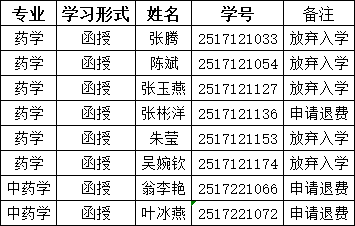 經(jīng)班主任聯(lián)系確認(rèn)、函授站核查, 中國(guó)藥科大學(xué)高等學(xué)歷繼續(xù)教育2025級(jí)張騰等8名新生逾期未繳費(fèi)或申請(qǐng)退費(fèi)、未辦理入學(xué)手續(xù),現(xiàn)將相關(guān)情況予以公示。