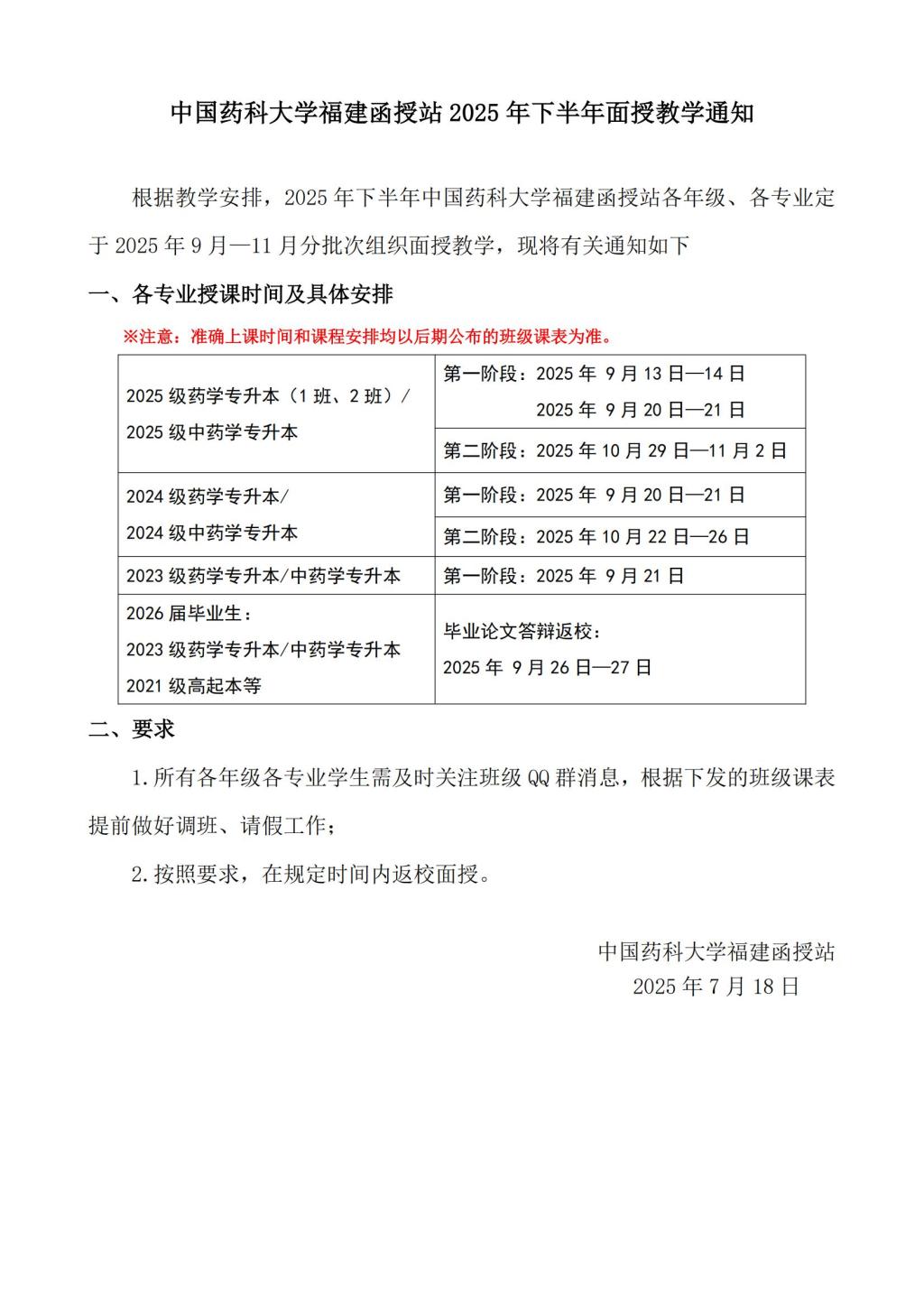 中國藥科大學(xué)福建函授站2025年下半年面授教學(xué)通知