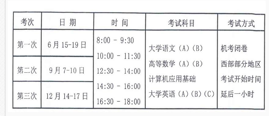 (1)《計(jì)算機(jī)應(yīng)用基礎(chǔ)》、《大學(xué)英語(yǔ)》B兩門統(tǒng)考課程全部采用混編考場(chǎng)方式。報(bào)考時(shí)間如下: