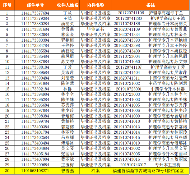 1.部分同學未在規(guī)定時間內(nèi)到我院微信公眾號核對郵寄信息并確認的學生,請于工作日上班時間按要求自行到校領(lǐng)取。除1位同學加群登記檔案郵寄信息并支付郵寄費外,其他同學的畢業(yè)證書和檔案同時寄送到學生個人手中。