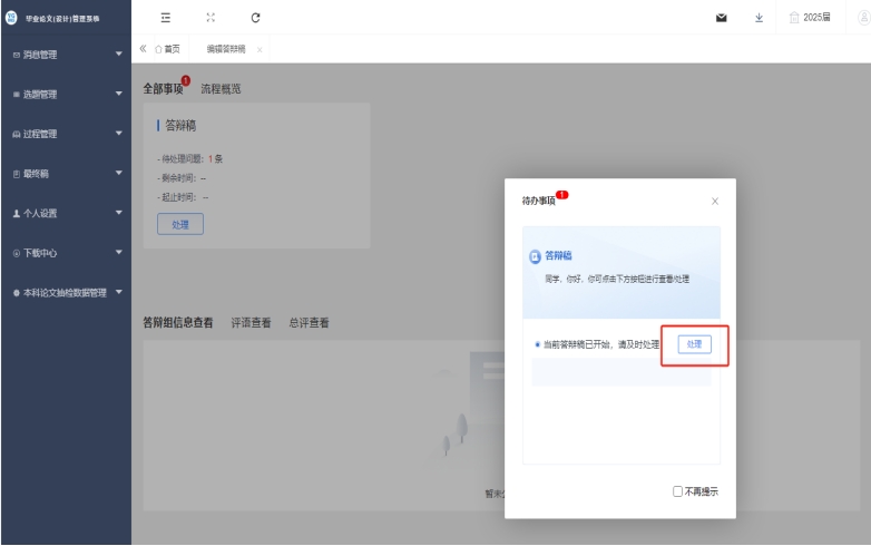 方式一:通過彈出的“待辦事項(xiàng)”提示框點(diǎn)擊“處理”進(jìn)入,上傳論文。上傳完成后點(diǎn)擊“確定”完成提交。