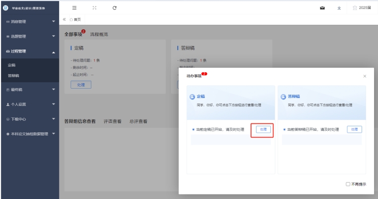 方式一:通過彈出的“待辦事項(xiàng)”提示框點(diǎn)擊 “定稿” 中的“處理”進(jìn)入,上傳論文。上傳完成后點(diǎn)擊“確定”完成提交。答辯稿處理提出不用理會(huì)。
