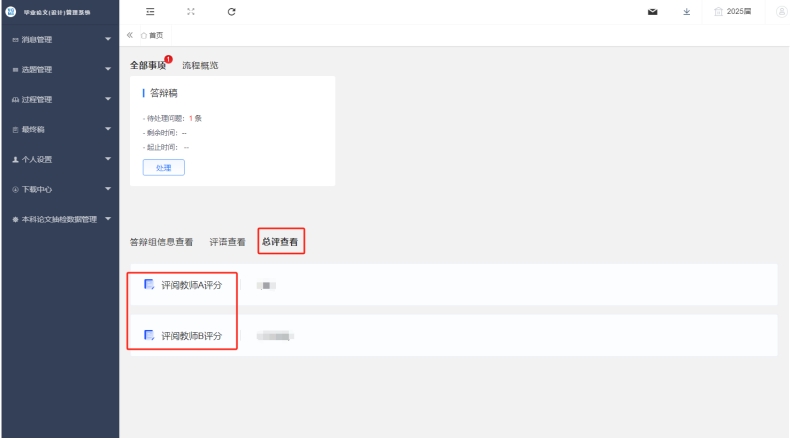 登錄論文系統(tǒng),在首頁-“總評(píng)查看”中可查看成績,點(diǎn)擊“評(píng)閱教師A評(píng)分”、 “評(píng)閱教師B評(píng)分”可分別查看評(píng)閱意見。