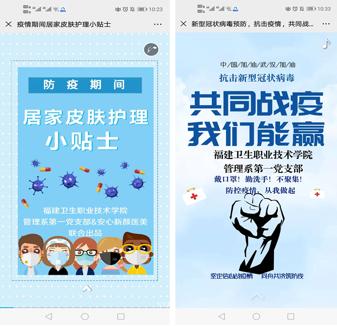 “你在家里戰(zhàn)斗,我為你提供居家隔離生活的‘調(diào)味品’?!惫芾硐档谝稽h支部聯(lián)合預(yù)防醫(yī)學(xué)教研室,在國(guó)家衛(wèi)生健康委員會(huì)和中國(guó)營(yíng)養(yǎng)學(xué)會(huì)編寫的“疫情防控期間系列膳食指導(dǎo)”基礎(chǔ)上,根據(jù)同學(xué)們的生活特點(diǎn),整理了飲食中應(yīng)注意的事項(xiàng),制作《平衡膳食、合理營(yíng)養(yǎng),助您抗“疫”》,科學(xué)引導(dǎo)學(xué)生在疫情期間做到合理營(yíng)養(yǎng),增強(qiáng)抵抗力。聯(lián)合醫(yī)學(xué)美容教研室、安心新顏醫(yī)美制作《疫情期間居家皮膚護(hù)理小貼士》H5,“宅家也要美美的,拒絕蓬頭垢面?!?;聯(lián)合健康管理與體育保健教研室制作《科學(xué)鍛煉、強(qiáng)身健體,助您抗“疫”》科學(xué)運(yùn)動(dòng)指南,從運(yùn)動(dòng)項(xiàng)目、運(yùn)動(dòng)強(qiáng)度、運(yùn)動(dòng)時(shí)間、運(yùn)動(dòng)頻率和注意事項(xiàng)等方面進(jìn)行科學(xué)指導(dǎo),引導(dǎo)師生科學(xué)適度的運(yùn)動(dòng)鍛煉提高人體免疫力,有效預(yù)防慢性疾病。