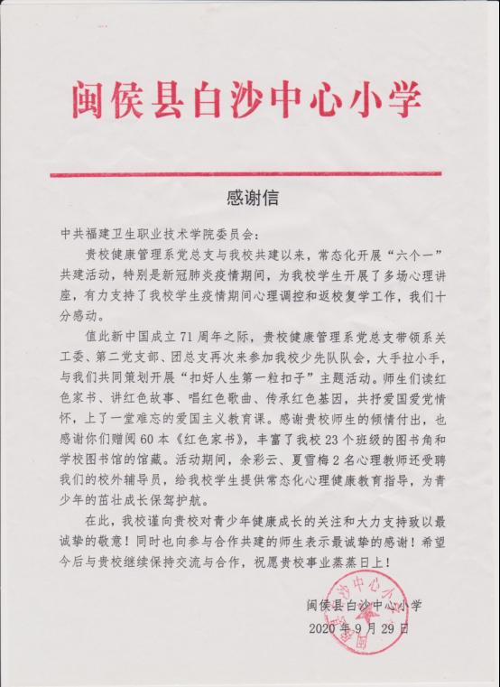 近日,白沙中心小學(xué)向我校發(fā)來感謝信,感謝健康管理系黨總支與他們常態(tài)化開展“六個一”共建活動,特別是新冠肺炎疫情期間,給學(xué)校提供的心理健康服務(wù)支持及國慶前夕給學(xué)生們帶來的愛國主義教育課。