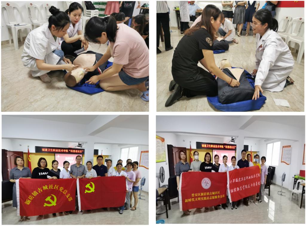 為扎實(shí)推進(jìn)全民科學(xué)素質(zhì)行動(dòng),弘揚(yáng)科學(xué)精神,普及科學(xué)知識(shí)及醫(yī)學(xué)急救常識(shí),2021年5月27日,福建衛(wèi)生職業(yè)技術(shù)學(xué)院繼續(xù)教育學(xué)院黨支部、醫(yī)學(xué)系第三黨支部、中醫(yī)教研室、質(zhì)量管理辦公室黨支部聯(lián)合開展“科普進(jìn)社區(qū)”——心肺復(fù)蘇技能培訓(xùn)活動(dòng),在晉安區(qū)新店鎮(zhèn)古城社區(qū)向居民普及醫(yī)療急救知識(shí)和現(xiàn)場(chǎng)處置能力,提高居民應(yīng)急意識(shí)、知識(shí)和技能,讓更多居民在家門口就可以學(xué)到應(yīng)急救護(hù)技能。
