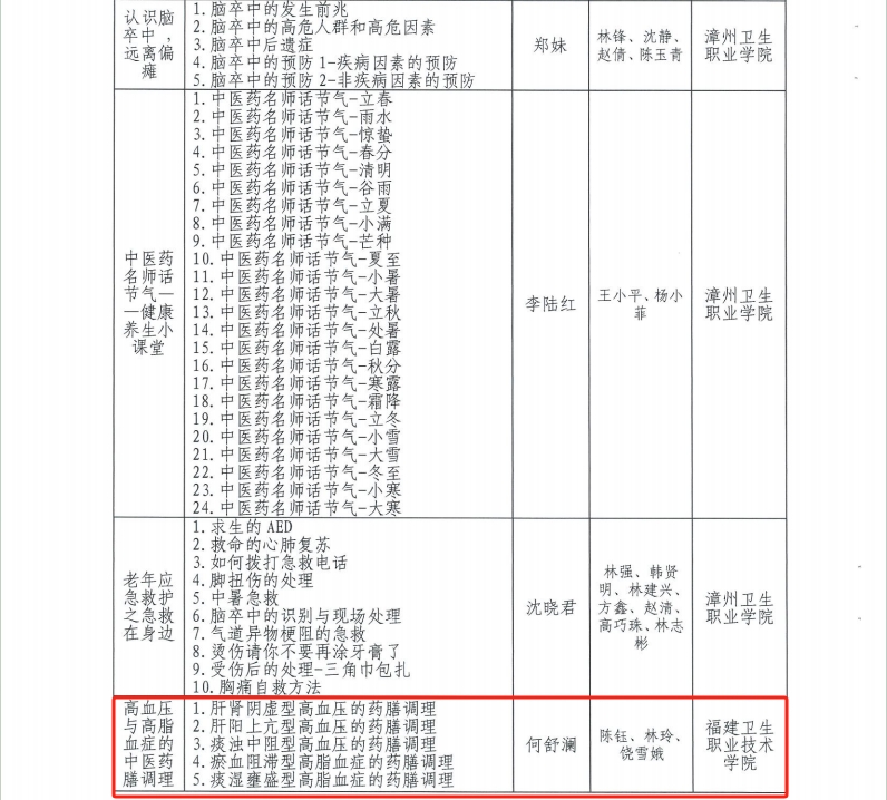 近日,福建省終身教育促進委員會公布了2023年福建省終身教育提質培優(yōu)項目,我校前期申報的4個項目成功入選,其中健康管理系陳愛珍老師申報的《基層公共衛(wèi)生終身教育創(chuàng)新基地》入選終身教育創(chuàng)新基地;醫(yī)學院林國威老師申報的《老年人智慧健康伴侶實驗項目》、醫(yī)學技術系鐘偉雄老師申報的《智慧醫(yī)療終身教育實驗項目》入選終身教育實驗項目;教務處何舒瀾老師申報的《高血壓與高脂血癥的中醫(yī)藥膳調理》入選社區(qū)(老年)教育課程資源。