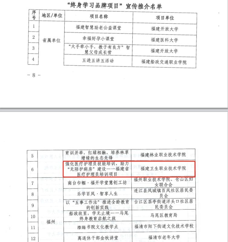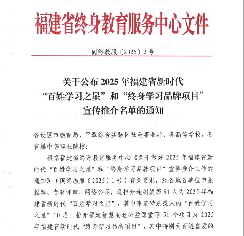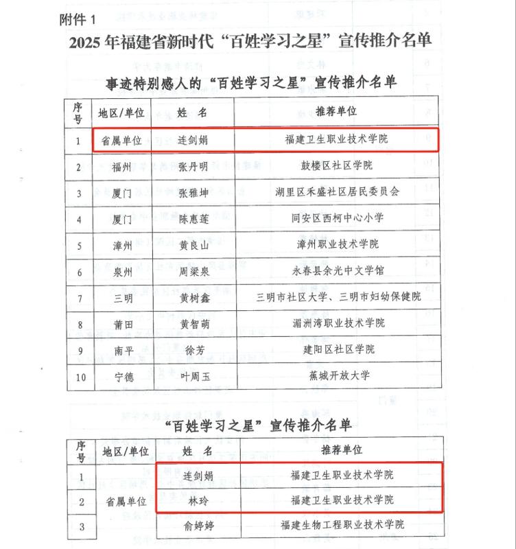 近日,福建省終身教育促進(jìn)委員會(huì)公布2025年“百姓學(xué)習(xí)之星”和“終身學(xué)習(xí)品牌項(xiàng)目”推介名單。我校護(hù)理學(xué)院連劍娟老師、藥學(xué)院林玲老師入選“百姓學(xué)習(xí)之星”,其中連劍娟老師更是躋身全省10位事跡特別感人的“百姓學(xué)習(xí)之星”行列。繼續(xù)教育學(xué)院和護(hù)理學(xué)院聯(lián)合申報(bào)的《強(qiáng)化醫(yī)療護(hù)理員技能培訓(xùn),助力“無陪護(hù)病房”建設(shè)——福建省醫(yī)療護(hù)理員培訓(xùn)項(xiàng)目》入選“終身學(xué)習(xí)品牌項(xiàng)目”。