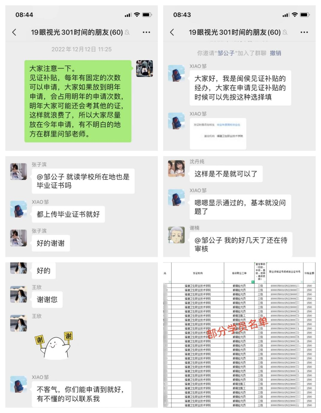 據(jù)悉,以往應(yīng)屆畢業(yè)生“見證補(bǔ)貼”資金申領(lǐng)需前往戶籍所在地人社局申請。且各地補(bǔ)貼資金申領(lǐng)政策差異較大、申請程序繁瑣等原因大大降低了學(xué)生的申請意愿。繼續(xù)教育學(xué)院在了解情況后,迅速組建黨員志愿服務(wù)隊(duì),聯(lián)合醫(yī)學(xué)技術(shù)系成立眼視光專業(yè)學(xué)生“見證補(bǔ)貼”工作專班,創(chuàng)建微信服務(wù)工作群,并邀請閩侯縣人社局審核專員入群指導(dǎo)。針對學(xué)生提出的各項(xiàng)問題給予了悉心指導(dǎo),解決學(xué)生在證書補(bǔ)貼申領(lǐng)流程上的諸多疑問,大大提升了申領(lǐng)效率,打通證書補(bǔ)貼資金申領(lǐng)“最后一公里”。截至目前,我校共有126名學(xué)生成功申領(lǐng)補(bǔ)貼,三級證書(高級)每人可領(lǐng)取補(bǔ)貼1500元,合計(jì)補(bǔ)助金額189000元。
