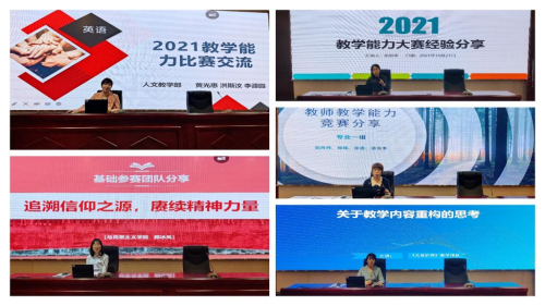 本次交流會(huì)共有5位獲獎(jiǎng)教師代表和1位評(píng)委代表上臺(tái)發(fā)言。來(lái)自人文教學(xué)部的黃光惠老師圍繞參賽團(tuán)隊(duì)(人和)、時(shí)間管理(天時(shí))、參賽場(chǎng)地(地利)、賽后反思四個(gè)部分進(jìn)行交流。馬克思主義學(xué)院的顏冰鳳老師重點(diǎn)分享了在教師教學(xué)能力比賽中有關(guān)課程整體設(shè)計(jì),尤其是課程選題的重要性。來(lái)自藥學(xué)院的張麗華與劉丹丹兩位老師結(jié)合各自團(tuán)隊(duì)在拍攝教學(xué)視頻過(guò)程中遇到的教學(xué)材料組織、視頻拍攝以及有關(guān)信息泄露的問(wèn)題,分享了課程重組、視頻拍攝場(chǎng)景選取以及嚴(yán)防細(xì)查信息泄露的重要性。護(hù)理學(xué)院獲獎(jiǎng)團(tuán)隊(duì)代表林旭星老師分享了在課程選題的過(guò)程中要充分展現(xiàn)學(xué)科和專(zhuān)業(yè)的校本特色,才更有機(jī)會(huì)在比賽中取得優(yōu)異的成績(jī)。