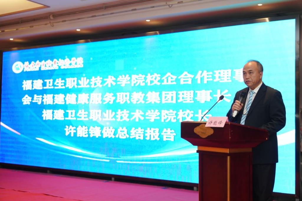 會議最后,我校校長許能鋒作總結(jié)發(fā)言。他希望集團成員們攜手努力,一是加強資源共享,切實提升人才培養(yǎng)成效;二是深化產(chǎn)教融合,服務(wù)衛(wèi)生健康產(chǎn)業(yè)發(fā)展;三是打造平臺,探索衛(wèi)生健康職教特色之路,共同走出、走好一條具有福建特色的醫(yī)藥衛(wèi)生健康職業(yè)教育高質(zhì)量發(fā)展之路。