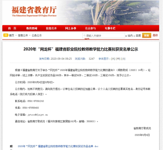 近日,2020年“網(wǎng)龍杯”福建省職業(yè)院校教師教學(xué)能力比賽線上決賽落下帷幕,我院教師榮獲3項(xiàng)專業(yè)課程組一等獎(jiǎng)、1項(xiàng)專業(yè)課程組二等獎(jiǎng)、1項(xiàng)公共基礎(chǔ)課程組二等獎(jiǎng)、1項(xiàng)專業(yè)課程組三等獎(jiǎng)、2項(xiàng)公共基礎(chǔ)課程組三等獎(jiǎng),共斬獲8項(xiàng)獎(jiǎng)項(xiàng)。