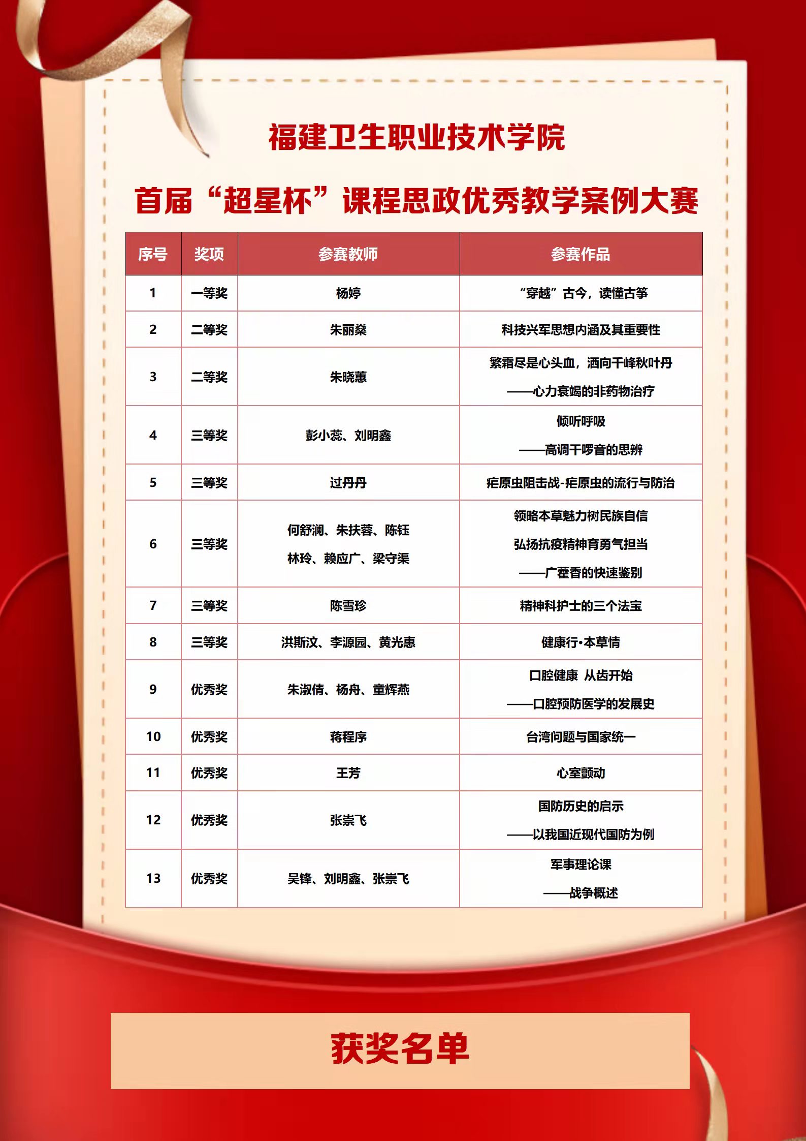 2021年9月,首屆“超星杯”全國(guó)職業(yè)院校課程思政優(yōu)秀教學(xué)案例大賽開(kāi)賽,本次大賽共收到143所職業(yè)院校600多個(gè)教學(xué)團(tuán)隊(duì)的作品,設(shè)一等獎(jiǎng)6項(xiàng)、二等獎(jiǎng)16項(xiàng)、三等獎(jiǎng)30項(xiàng)、優(yōu)秀獎(jiǎng)60項(xiàng),獲獎(jiǎng)率不到19%。經(jīng)過(guò)激烈角逐,我校教學(xué)團(tuán)隊(duì)斬獲一等獎(jiǎng)1項(xiàng),二等獎(jiǎng)2項(xiàng),三等獎(jiǎng)5項(xiàng),優(yōu)秀獎(jiǎng)5項(xiàng),獲獎(jiǎng)數(shù)目占總獲獎(jiǎng)數(shù)的12%,成為本次大賽獲獎(jiǎng)數(shù)最多的學(xué)校。