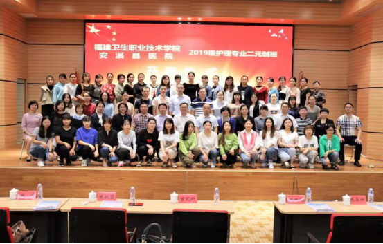 10月22日上午,我校與安溪縣醫(yī)院聯(lián)合舉辦2019級護理專業(yè)的“二元制”班開班儀式,本次儀式在安溪縣醫(yī)院隆重舉行。我校黨委書記曾武祈、教務處處長朱扶蓉、護理系書記謝濤、護理系主任龔海蓉、臨床醫(yī)學系書記陳俊穎、教務處副處長梁艷,安溪縣衛(wèi)健局副局長林曲迎、安溪縣醫(yī)院院長陳鑫壇、安溪縣醫(yī)院書記陳傳昌以及相關工作人員出席本次開班儀式,儀式由安溪縣醫(yī)院副院長劉朝陽主持。