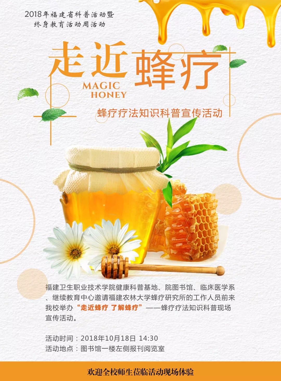 2018年10月18日,圖書館、臨床醫(yī)學(xué)系、繼續(xù)教育中心將邀請(qǐng)福建農(nóng)林大學(xué)蜂療研究所的工作人員前來我校舉辦“走近蜂療 了解蜂療”——蜂療療法知識(shí)科普現(xiàn)場(chǎng)宣傳活動(dòng) ,歡迎全院師生參與。