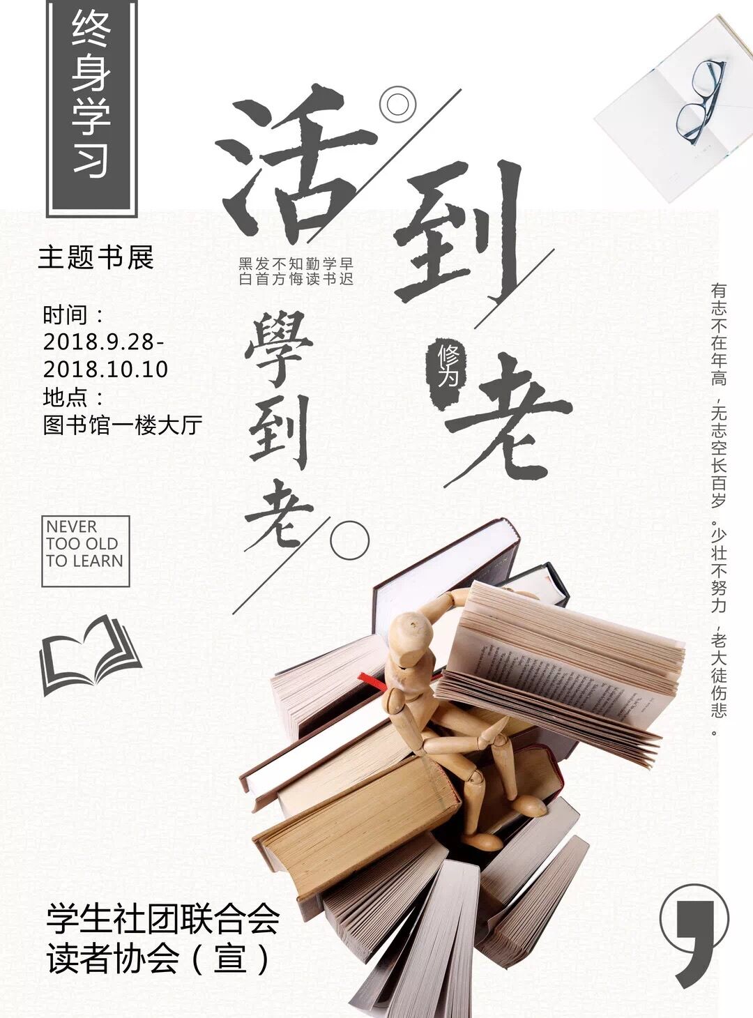在“全民終身學習活動周”來臨之際,圖書館特舉辦“活到老、學到老”主題書展,精選各類好書百余冊在圖書館一樓大廳進行展示,持續(xù)時間為2018年9月28日至10月10日,歡迎師生讀者前來借閱。