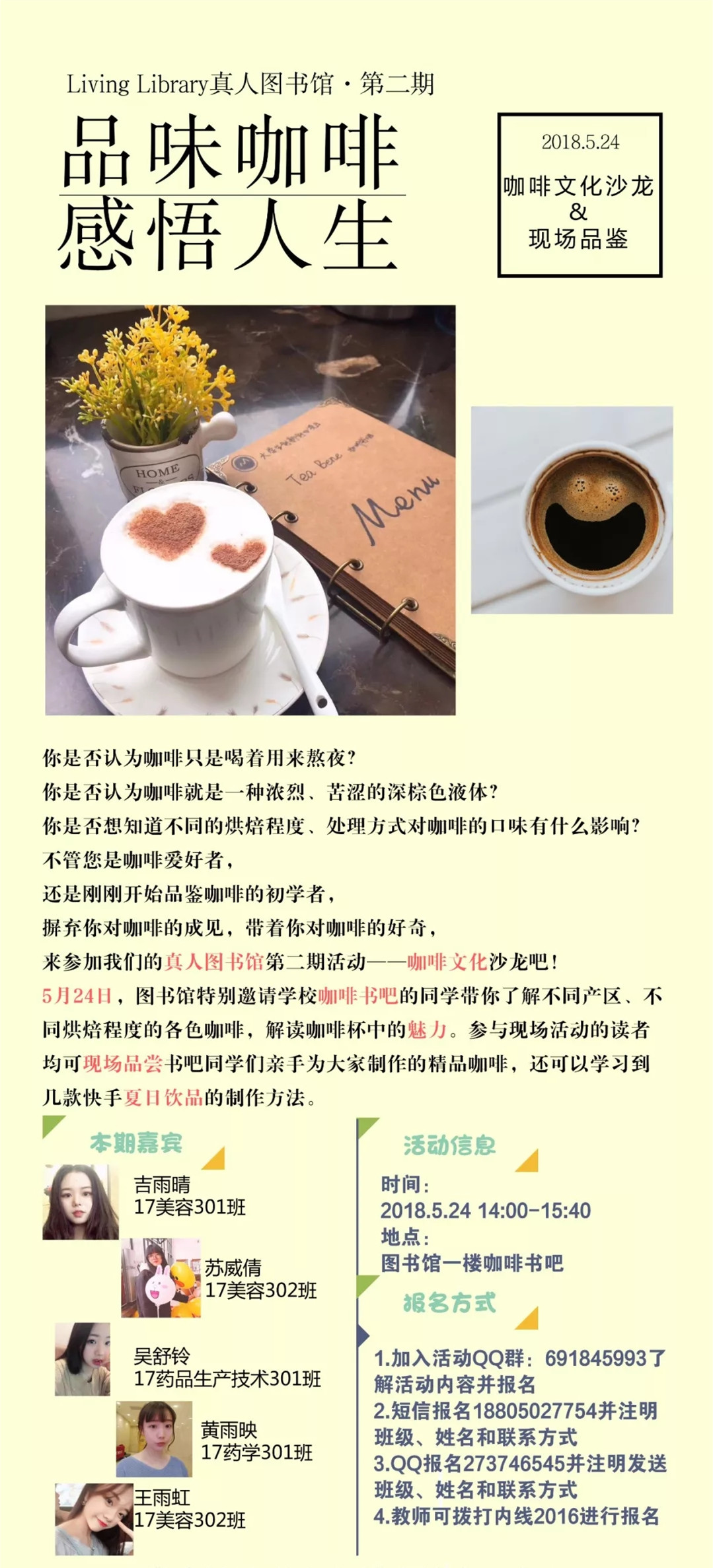 第二期真人圖書館——“咖啡文化沙龍&現(xiàn)場品鑒”活動將于5月24日(本周四)下午2點在圖書館一樓咖啡書吧舉行,屆時歡迎師生讀者的參與。