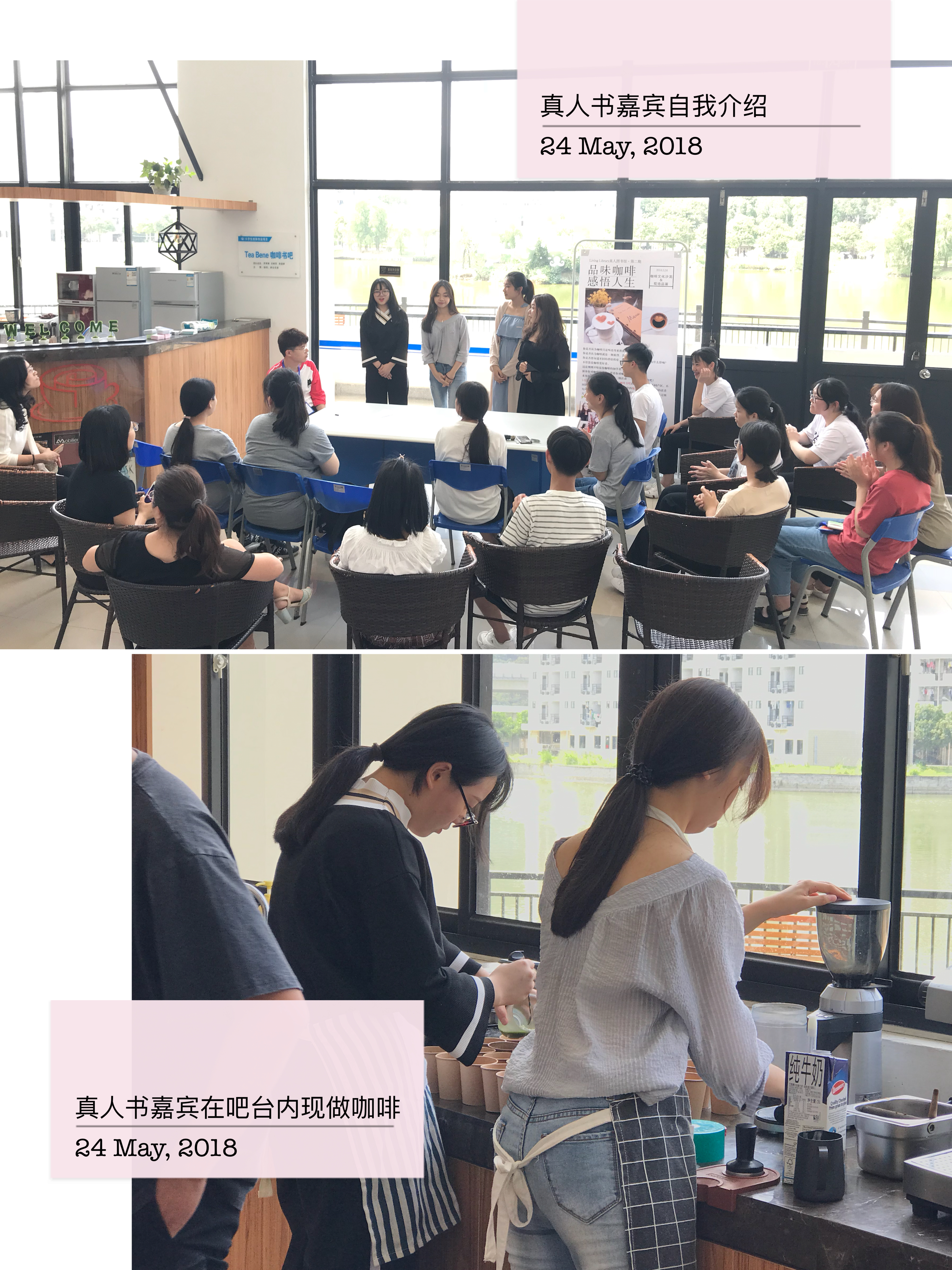 5月24日下午2點,第二期真人圖書館——“咖啡文化沙龍&現(xiàn)場品鑒”活動在我館一樓咖啡書吧如期舉行。本期活動共有六位真人書嘉賓,她們是17美容301吉雨晴、17美容302蘇威倩和王雨虹、17藥品生產技術301吳舒鈴、17美容301劉心悅、17影像301蔡四特。