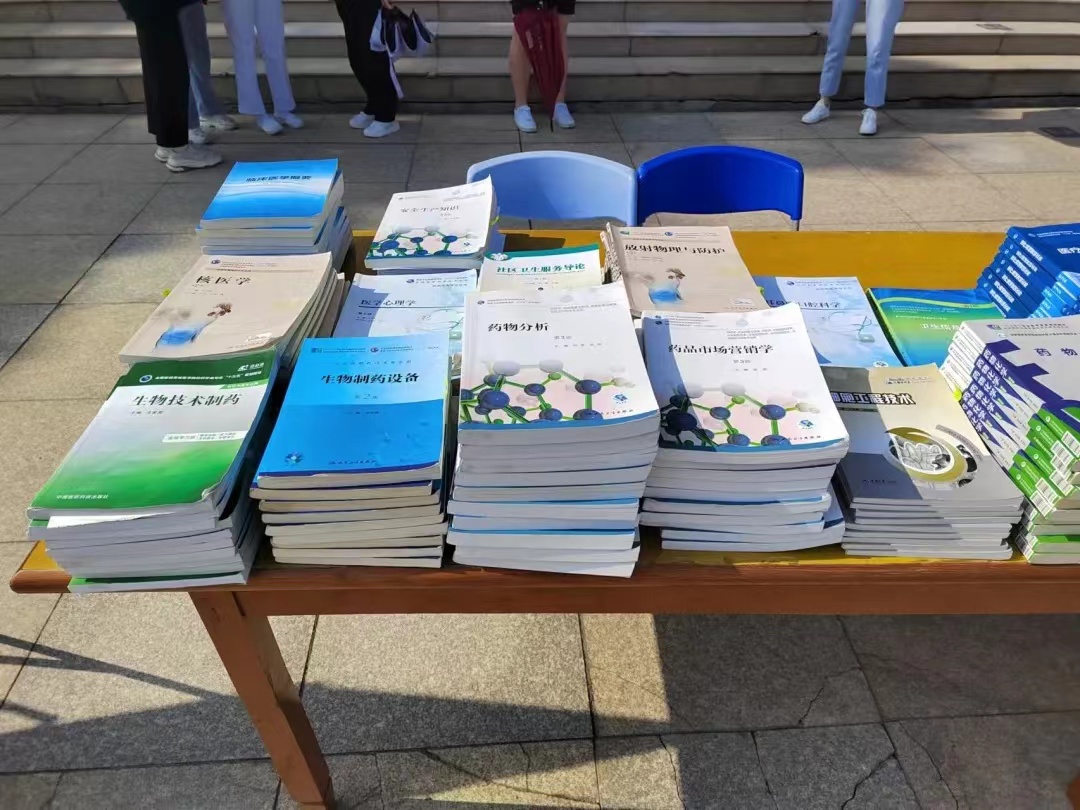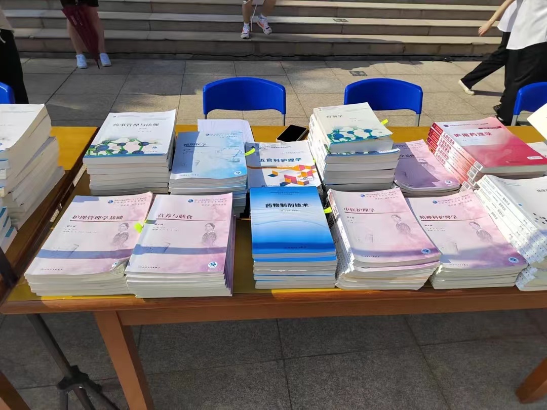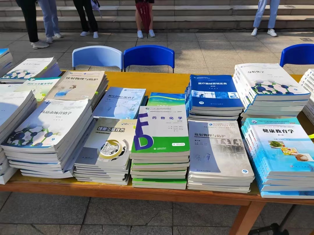 活動開始前,圖書館老師指導讀者協(xié)會學生干部、志愿者布置活動現(xiàn)場,并提前將桌椅和舊教材等活動用品搬到圖書館前廣場?;顒赢斕炜晒┟赓M領(lǐng)取的舊教材,均是在捐書活動中收到的捐贈舊教材。工作人員將舊教材按類整齊擺放,陳列了3張閱覽桌。尚在籌備時段就吸引了許多學生駐足圍觀。