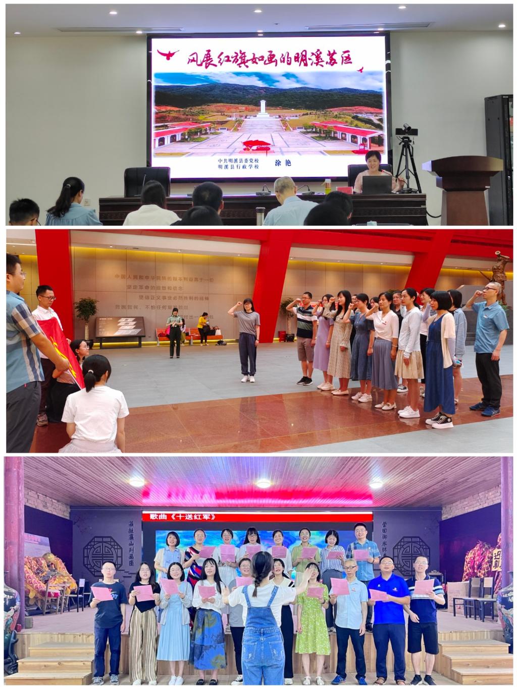 “寧化、清流、歸化,路隘林深苔滑。今日向何方,直指武夷山下。山下山下,風(fēng)展紅旗如畫。”一首毛澤東同志的《如夢令·元旦》讓馬院教師重回革命戰(zhàn)爭年代如火如荼的斗爭場景,重溫革命先烈用鮮血和生命鑄就的蘇區(qū)精神。在理論教學(xué)環(huán)節(jié)中,明溪縣委黨校高級講師涂艷為馬院教師作《風(fēng)展紅旗如畫的明溪蘇區(qū)》專題講座。她從“路隘林深苔滑——血與火的革命實(shí)踐”“風(fēng)展紅旗如畫——譜寫時(shí)代的新篇章”等兩部分為教師們上了一堂生動的黨史思政課?!帮嬎荚?,決不能忘了老區(qū)蘇區(qū)人民。”為銘記習(xí)近平總書記的囑托,深化黨史學(xué)習(xí)成效,馬院教師前往寧化縣長征出發(fā)紀(jì)念館、明溪縣革命紀(jì)念園、夏陽鄉(xiāng)“中央紅軍村”御簾村、曹坊中央紅軍長征集結(jié)出發(fā)地、滴水巖紅軍戰(zhàn)地醫(yī)院舊址等歷史遺跡和愛國主義教育基地開展現(xiàn)場教學(xué)。在教學(xué)現(xiàn)場,馬院教師們聆聽著邱門雙烈士、賴水金英雄、銅鐵嶺戰(zhàn)斗、戰(zhàn)地醫(yī)院等一個(gè)個(gè)感人至深的故事,銘記長征精神、蘇區(qū)精神,堅(jiān)定革命理想高于天,讓傳承紅色基因、理想信念之光照亮鑄魂育人之路。在長征出發(fā)紀(jì)念館,全體思政課黨員教師重溫入黨誓詞,點(diǎn)燃了思政人干事創(chuàng)業(yè)、講好中國故事的激情。