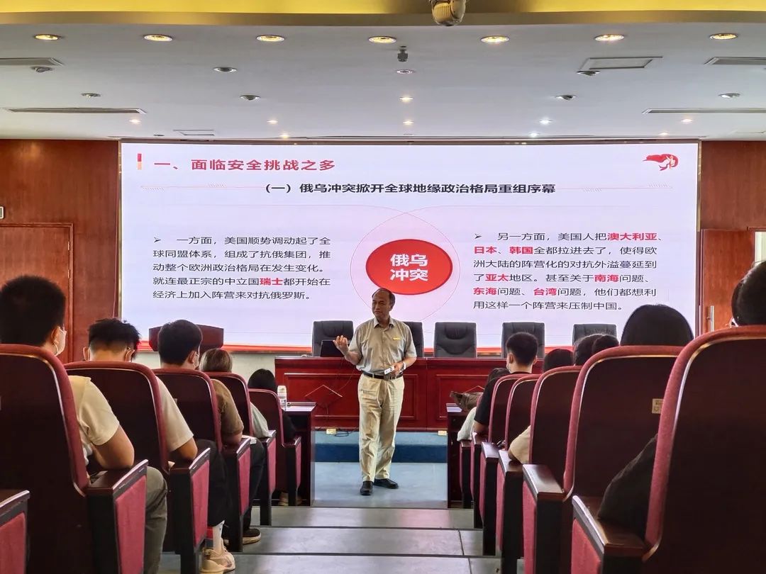 曾武祈以“牢樹全球視野 厚植家國情懷 以青春擔(dān)當(dāng)踐行人類命運(yùn)共同體理念”為題,著重梳理了當(dāng)前復(fù)雜多變的國際局勢(shì)、黨和國家面臨的安全挑戰(zhàn)及其背后動(dòng)因,為師生們帶來了一堂理論深刻、視野開闊、內(nèi)容豐富,極具吸引力和感染力的形勢(shì)政策課。在他的講述中,廣大師生充分感受到了中國在全球變局中化危為機(jī)、勇毅前行的卓越能力。曾武祈指出,黨的二十大必將擘畫發(fā)展新藍(lán)圖,贏得更加偉大的勝利和榮光。廣大師生應(yīng)比以往更加堅(jiān)定地迎接世界的變革與挑戰(zhàn),以實(shí)際行動(dòng)詮釋自己對(duì)國家和民族的責(zé)任和擔(dān)當(dāng)。