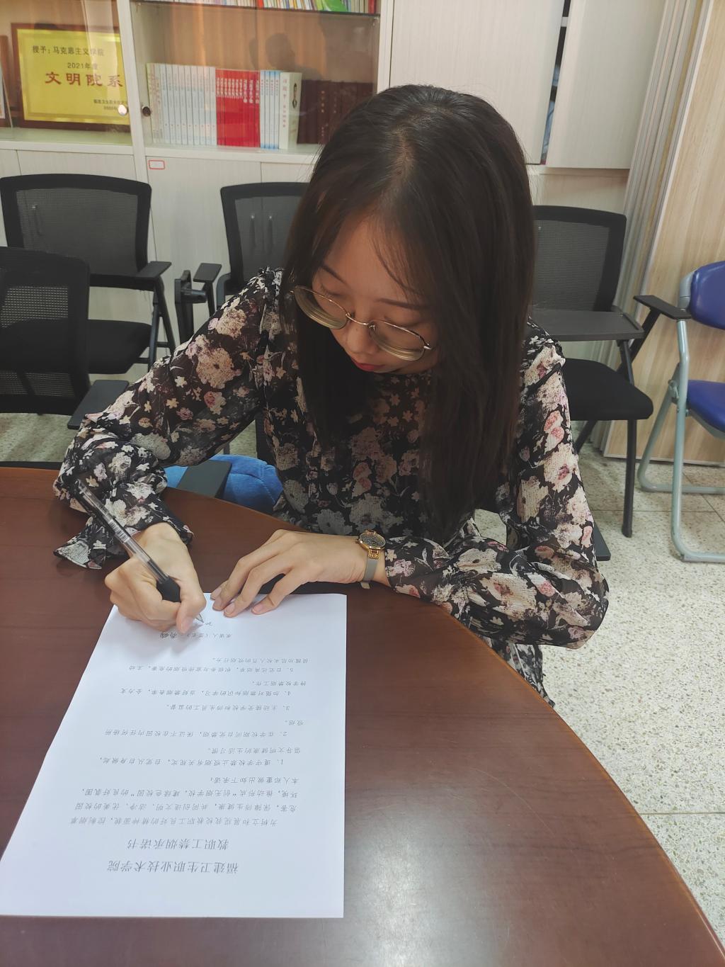 馬克思主義學(xué)院院長熊美蘭對吸煙有害健康的科學(xué)知識和學(xué)???zé)煿ぷ鬟M(jìn)行宣傳教育,號召全體思政課教師應(yīng)以身作則,主動開展控?zé)煿ぷ?,營造健康、無煙的校園環(huán)境,為創(chuàng)建無煙校園添磚加瓦。隨后組織新入職教師蔣楠老師宣誓并簽訂“教職工禁煙承諾書”。