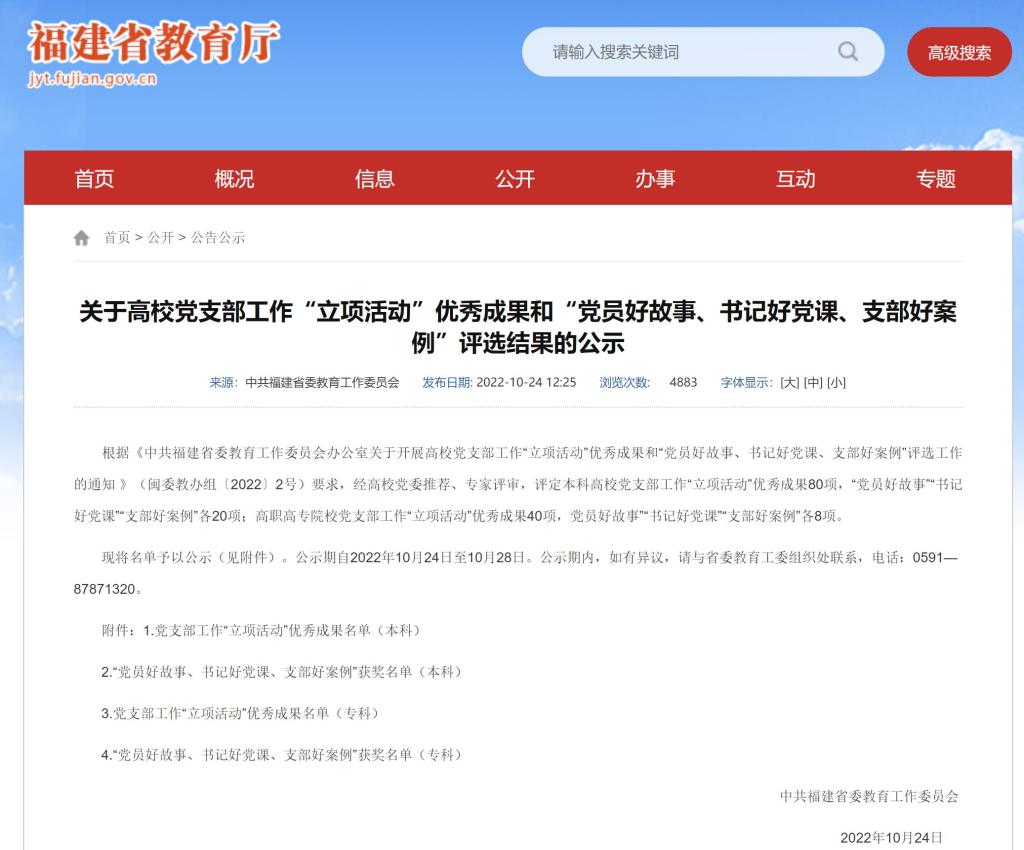 根據(jù)《中共福建省委教育工作委員會(huì)辦公室關(guān)于開(kāi)展高校黨支部工作“立項(xiàng)活動(dòng)”優(yōu)秀成果和“黨員好故事、書(shū)記好黨課、支部好案例”評(píng)選工作的通知 》(閩委教辦組〔2022〕2號(hào))要求,經(jīng)高校黨委推薦、專(zhuān)家評(píng)審,評(píng)定本科高校黨支部工作“立項(xiàng)活動(dòng)”優(yōu)秀成果80項(xiàng),“黨員好故事”“書(shū)記好黨課”“支部好案例”各20項(xiàng);高職高專(zhuān)院校黨支部工作“立項(xiàng)活動(dòng)”優(yōu)秀成果40項(xiàng),黨員好故事”“書(shū)記好黨課”“支部好案例”各8項(xiàng)。