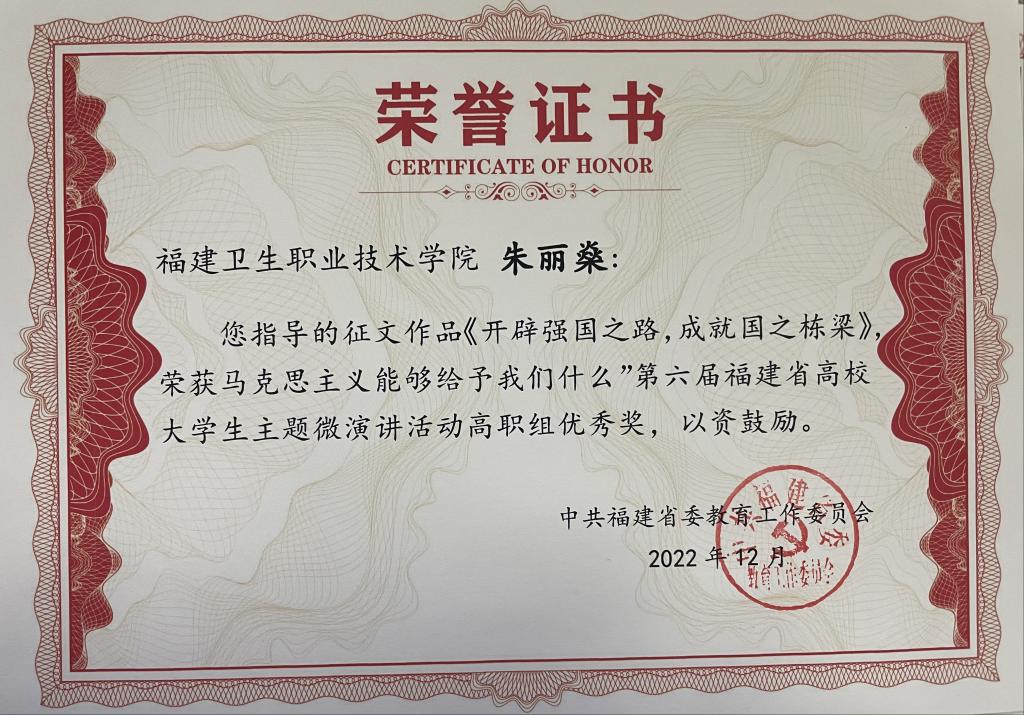 近日,中共福建省委教育工委公布第六屆“馬克思主義能夠給予我們什么”福建省高校大學(xué)生主題征文和微演講活動(dòng)獲獎(jiǎng)名單通知,我校馬克思主義學(xué)院朱麗燊老師指導(dǎo)的征文作品《開辟?gòu)?qiáng)國(guó)之路 成就國(guó)之棟梁》榮獲高職組優(yōu)秀獎(jiǎng)。