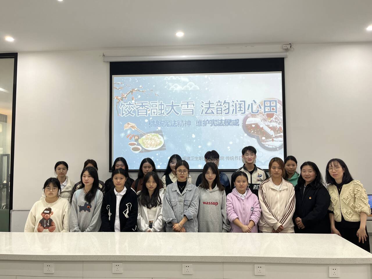 為推動中華優(yōu)秀傳統(tǒng)文化與法治理念深度融合的創(chuàng)新實踐,12月5日,由馬克思主義學院教師指導的傳統(tǒng)節(jié)日研習社,以大雪節(jié)氣與憲法宣傳周為契機,在“一站式”學生社區(qū)舉辦“餃香融大雪,法韻潤心田”主題活動。校黨委書記曾武祈到場指導,社團指導教師、馬克思主義學院第一黨支部全體黨員以及學生社團代表參加活動。